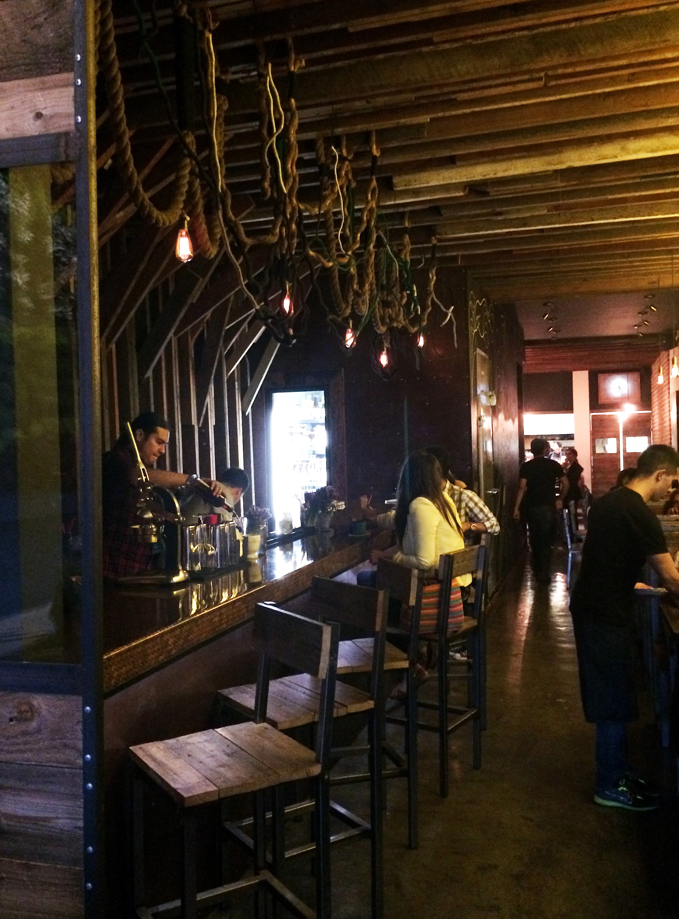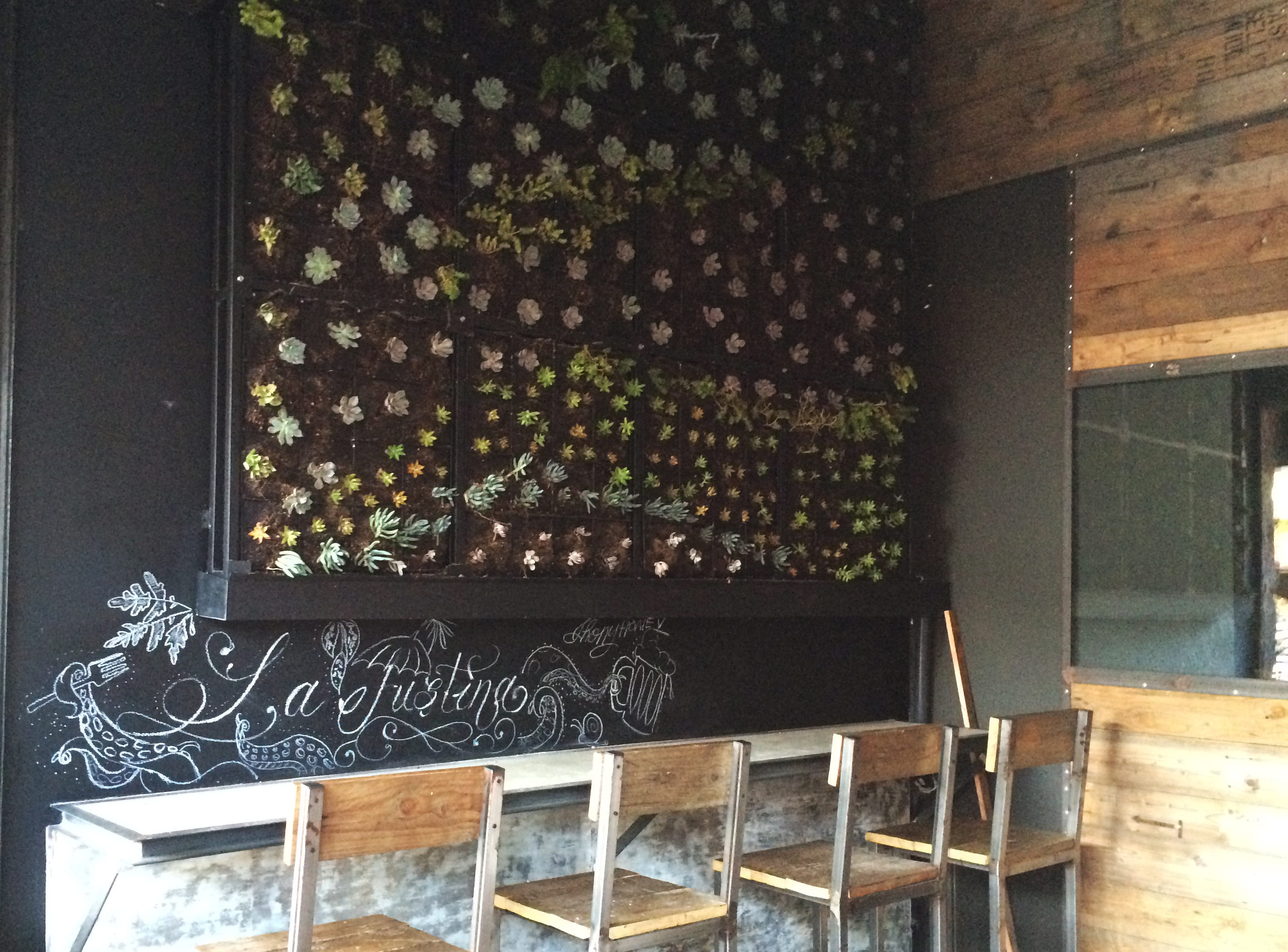 The restaurant is decorated in reclaimed and raw materials – wooden tables and chairs, hanging light bulb fixtures, exposed brick walls, rope chandeliers, a vertical succulent garden on the entry wall. A neon sign, original to Café La Especial, welcomes the stylish Tijuanense clientele. The vibe is effortless-chic by way of rustic-industrial.
